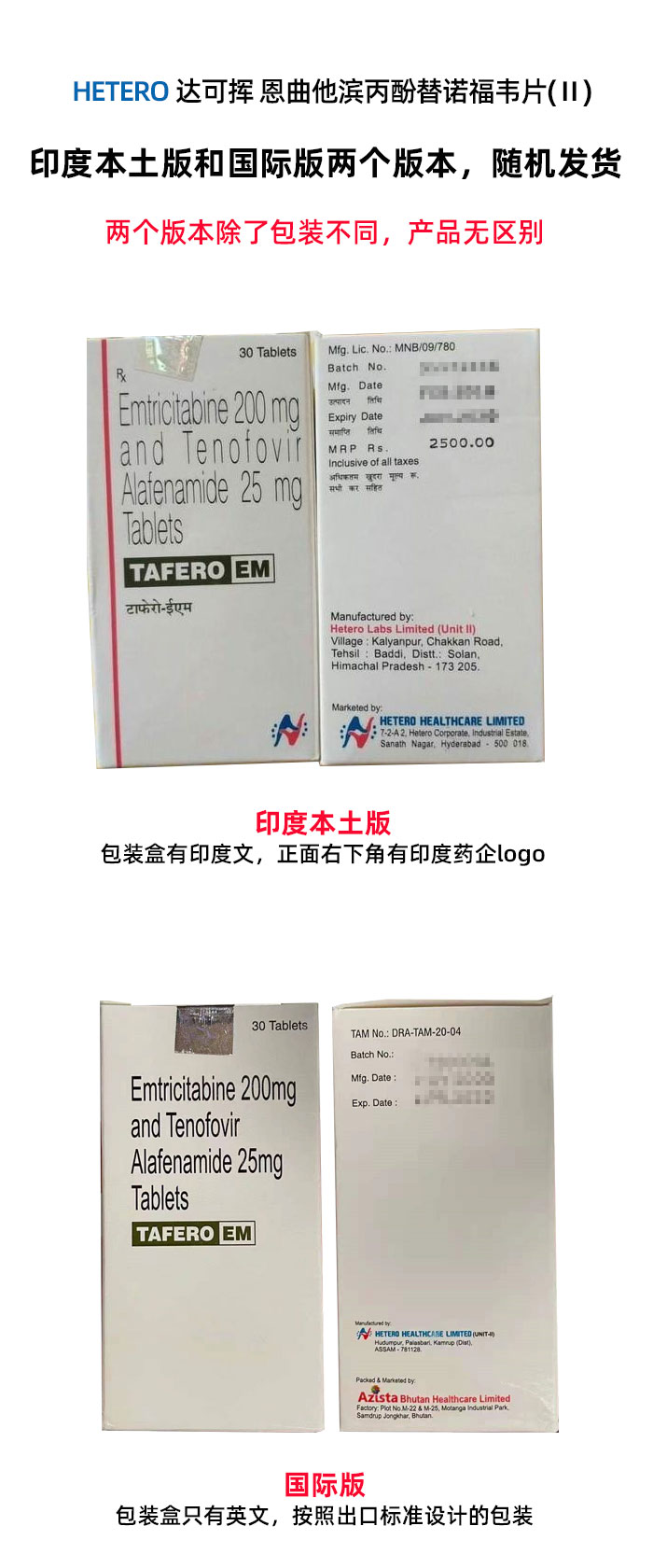 恩曲他滨替诺福韦艾拉酚片200mg+25mg*30片 TAFERO EM Emtricitabine 200mg and Tenovofir Alafenamide 25mg Tablets 达可挥