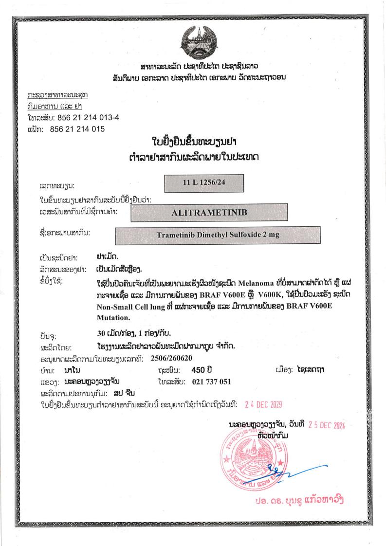 曲美替尼老挝国家药监局批准文号:11 L 1256/24