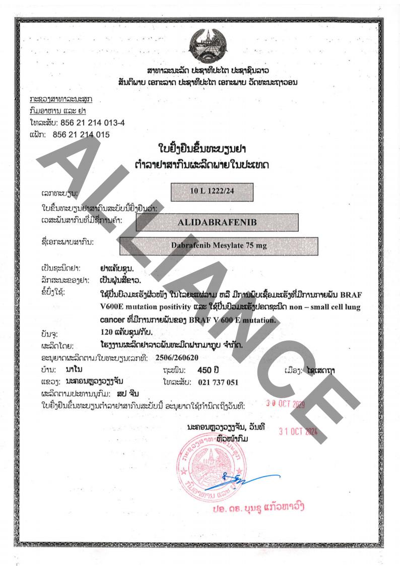 达拉非尼老挝国家药监局批准文号:10 L 1222/24